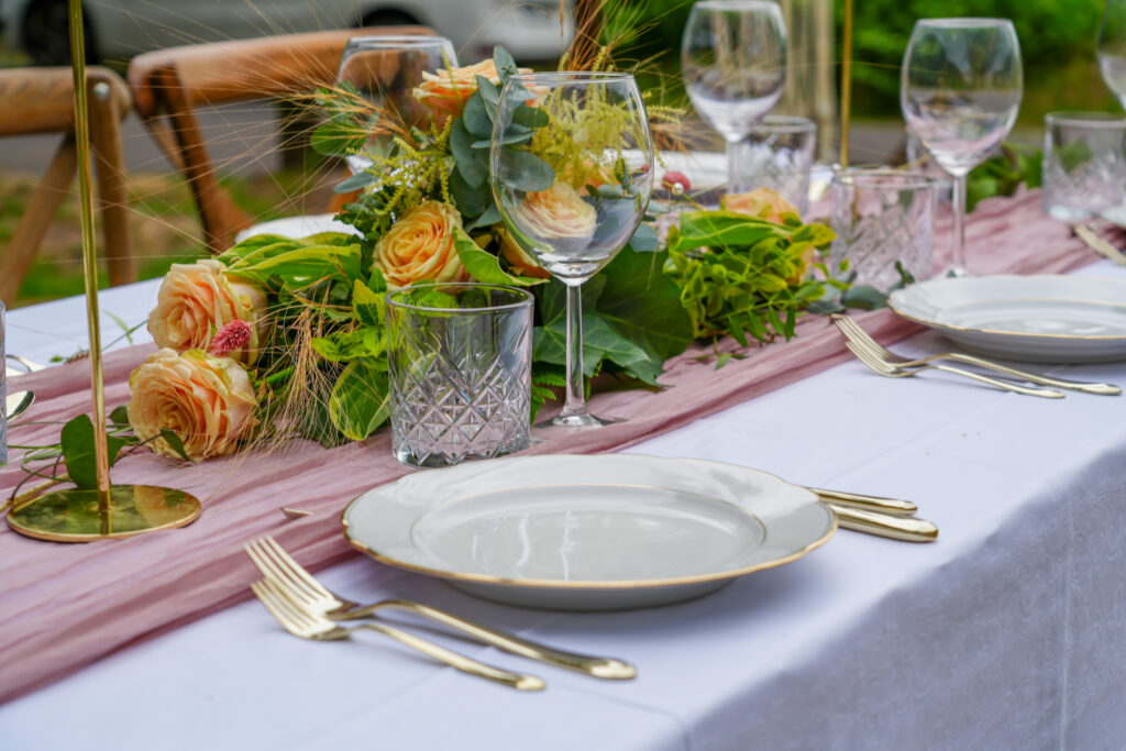 Edles Vintage-Geschirr mit Goldrand, Teller, Schüsseln & Gläser für besondere Anlässe. Stilvoll & hochwertig für Hochzeiten, Geburtstage & Events.